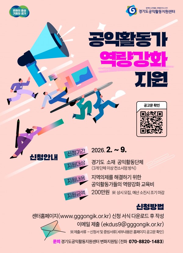 오늘은 #경기도공익활동지원센터에서 진행하는「2026년 공익활동가 역량강화지원 사업 모집 공고」 소식을 전해드립니다.