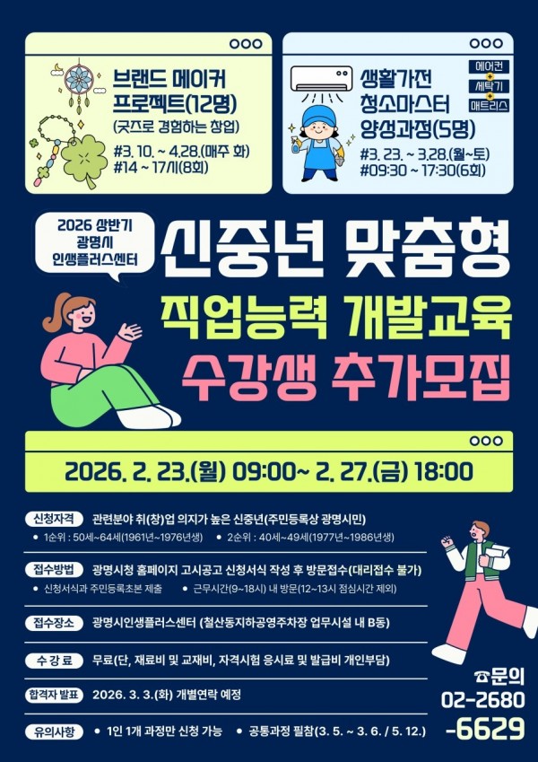[공익소식] 광명시인생플러스센터│2026년 상반기 신중년 맞춤형 직업능력개발교육 수강생 추가모집