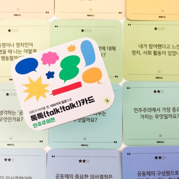 함께 묻고, 함께 배우며, 서로를 잇는 민주주의 질문카드로, 7가지 주제에 걸친 100가지 질문으로 구성되어 있습니다.