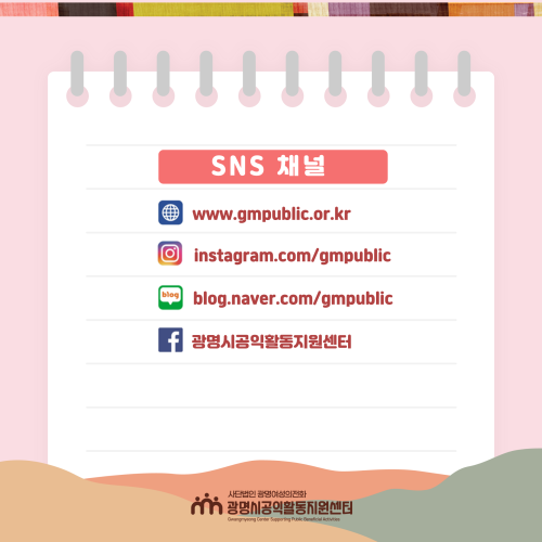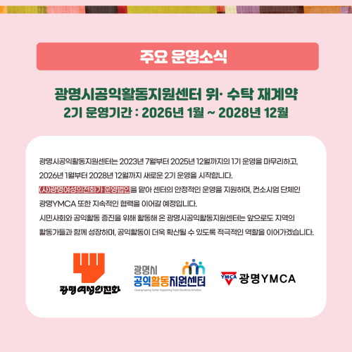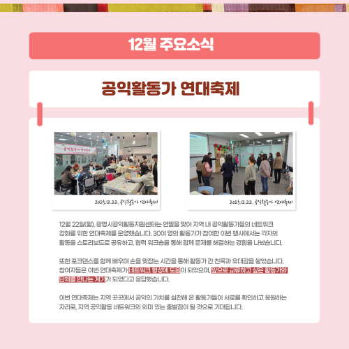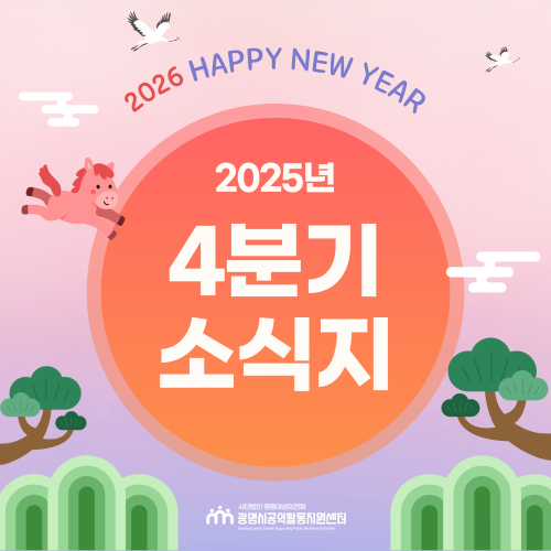 [공지] [뉴스레터 ]vol5_2025년 4분기 주요활동 작성자 최고관리자 작성일 2026.01.12 조회수 126 광명시공익활동지원센터 뉴스레터 Vol.5 목록 2026년 광명시 중간지원조직 공동사업설명회 참여 신청 [보도자료] '공익활동가 연대축제' 이야기·협력·춤으로 하나 된 공익활동가들의 연대의 시간