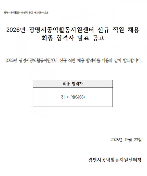 [공지] [채용]광명시공익활동지원센터 신규 직원 채용 최종 합격자 발표 작성자 최고관리자 작성일 2025.12.23 조회수 180 목록 [보도자료] '공익활동가 연대축제' 이야기·협력·춤으로 하나 된 공익활동가들의 연대의 시간 [채용]광명시공익활동지원센터 신규 직원 채용 서류 전형 합격자 발표