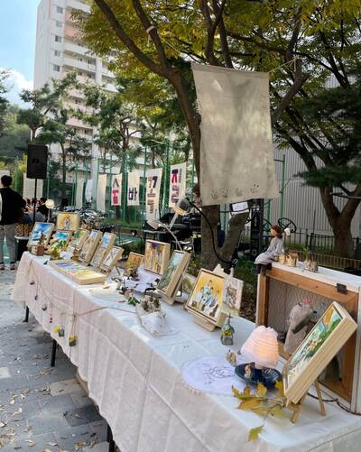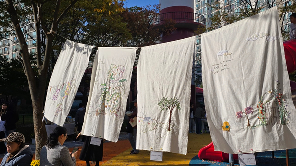 음악회와 별도로 놀이터 곳곳에서는 전시 무대가 펼쳐졌습니다. 도서관 미술동아리 ‘미스고’의 그림 작품 전시, 바느질 동아리 ‘오바하’의 프랑스자수 작품 전시, 우리마을 필경사들의 문장 필사 작품들이 전시됐답니다. 도서관은 책을 읽고 삶을 나누며 여러 취미 활동을 하는 곳입니다. 그동안 나눈 여러 이야기들 중에서 일부가 문장 필사의 내용으로 추려져, 행사장 주변에 세로 현수막으로 전시되었답니다. 그 작품들 중 일부는 음악회 프로그램에서 다시 노래와 낭송으로 등장했답니다.