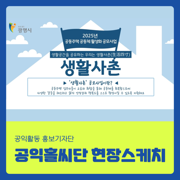 이러한 문제를 해소하기 위해 광명시는 생활사촌 사업을 추진하고 있습니다. 본 사업은 광명시마을자치센터를 중심으로 공동주택 거주민 간의 교류를 촉진하고, 상호 신뢰와 연대를 회복하는 것을 목적으로 합니다. 이는 단순한 주민 프로그램이 아니라, 공동주택 내에서 생활 기반형 사회적 안전망을 구축하려는 정책적 실험으로 볼 수 있습니다.