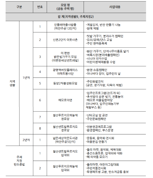 지역 생활 주제로 선정된 6개 팀에는 연차별로 차등 활동비가 지급됩니다. 올해 첫 선정된 공동체는 최대 1천만 원의 활동비를 지원받고 이전에 선정된 경험이 있는 공동체는 600~700만원, 두 번 이상 선정된 경우는 400만원까지 차등 지원을 받습니다. 이 외에 특별 주제로 탄소중립 실천 공동체 6개 팀을 선발하여 팀에 각 500만원이 지급되어, 친환경 활동을 통해 공동체와 지구 모두에 기여할 수 있습니다. 2025년 올해 광명시에서는 9개 단지에서 11개 팀이 사업을 진행 하고 있습니다.