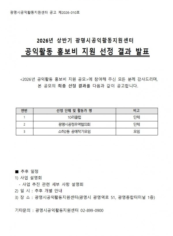 [공지] [공지사항] 2026년 상반기 공익활동 홍보비 지원 선정 결과 발표 작성자 최고관리자 작성일 2026.04.30 조회수 11 목록 [뉴스레터 ]vol6_2026년 1분기 주요활동