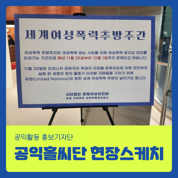 세계여성폭력추방주간은 #여성폭력 없는 사회를 만들기 위해 여성폭력 방지의 의미를 되새기고, 일상 속 폭력 근절을 촉구하기 위한 기간입니다. 이제 이 기간은 단순히 “여성에게만 일어나는 특정 폭력”을 말하는 것에서 그치지 않습니다. 우리가 일상에서 너무 익숙하게 대하는 본질적 #차별, #혐오, 낙인의 폭력까지 아우르고 있습니다. [#광명여성의전화]에서도 비단 여성에게만 행해지는 폭력뿐 아니라 다양한 형태의 폭력을 추방해야 한다고 외치고 있습니다. 폭력은 결코 특정 집단만의 문제가 아니며, 한 개인의 불운도 아닙니다. 물리적 폭력뿐 아니라 경제적, 정서적, 디지털 기반의 새로운 폭력과 차별도 모두 해결해야 할 과제인 것이지요. 우리 모두에게는 아픔의 순간이 존재합니다. 결국 그것은 누군가로부터 받은 폭력의 잔흔이지요. 우리가 눈감은 타인의 폭력은 결국 나에게 되돌아오기 마련입니다. 우리는 어떤 선택을 하고 어떤 행동을 해야 할지 스스로에게 질문해야 합니다.