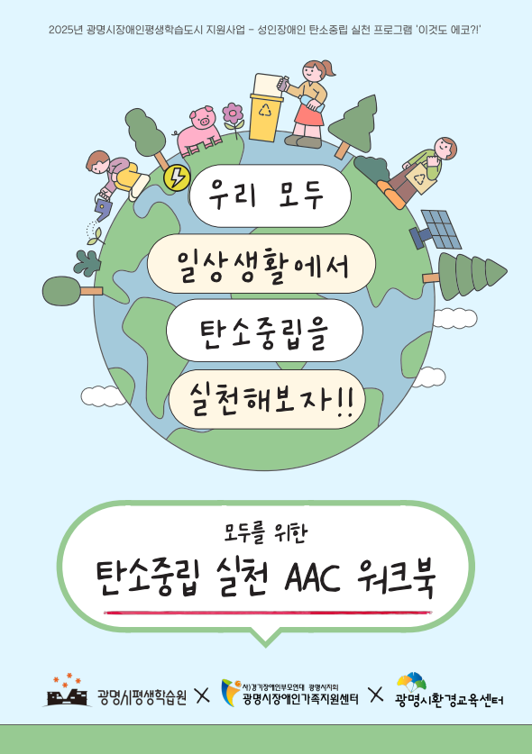 [광명시장애인가족지원센터×광명시환경교육센터] 모두를 위한 탄소중립 실천 AAC(보완대체의사소통) 워크북 첨부파일 : 2025년 탄소중립 실천 AAC 워크북_압축.pdf 다운로드 광명시장애인가족지원센터에서 발간한 '모두를 위한 탄소중립 실천 ACC(보완대체의사소통) 워크북'을 공유합니다. 목록 [경기도공익활동지원센터] 2025 공익활동페스타 '세계시민대회'
