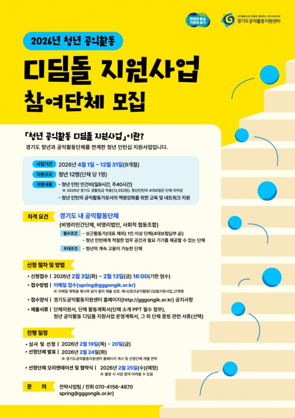 경기도공익활동지원센터는 경기도 청년과 공익활동단체 연계를 통해 청년들의 공익활동 일․경험 과정 개발 및 비영리 일자리 기반 조성을 위한 「2026년 청년 공익활동 디딤돌 지원사업」에 참여할 단체를 모집합니다.