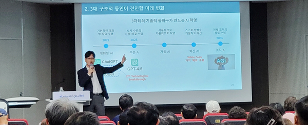 기술 변화의 문제도 불확실성을 키웁니다. 기술 변화, 특히 인공지능이 가져올 미래가 이날 강연의 주 내용입니다. 인공지능이 우리 사회의 패러다임을 바꾸고 있습니다. 놀라운 속도로 다가오는 것을 우리는 체감하고 있습니다. 2035년 AGI로 불리는 범용 AI가 개발될 것으로 전망합니다. 인공지능이 인간과 같아지거나 인간을 뛰어 넘는다는 전망입니다. 전문가들 사이에서 그 가능성을 두고 논란은 있지만 현재 진행되고 있는 기술변화의 속도를 과소평가해서는 안 된다는 것과