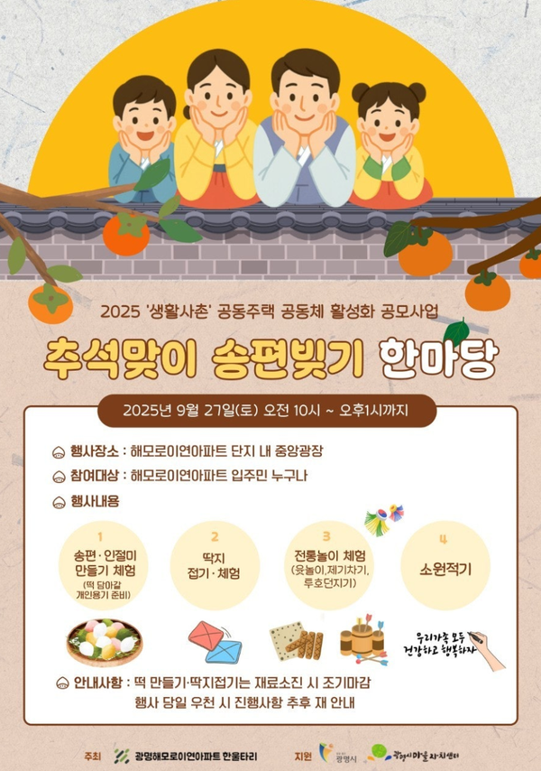 올해 처음 공동체 활동에 도전한 이 팀은 입주민을 대상으로 한 손뜨개 프로그램, 아나바다 장터, 재능기부 체험부스 등 다양한 활동을 진행하고 있습니다. 특히 2025년 9월 27일, 광명해모로이연아파트 단지 내 중앙광장에서는 이웃 간 친목을 도모하는 추석맞이 송편 빚기 한마당이 열렸습니다. 해모로이연아파트 입주민 누구나 즐겁게 참여할 수 있었으며, 체험 부스는 총 4개의 코너로 나뉘었습니다.