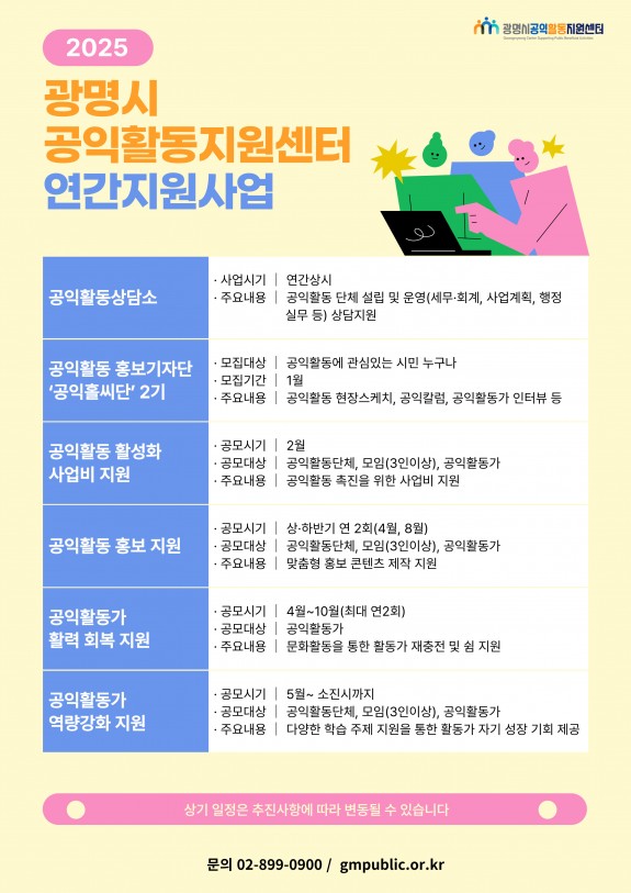 2025년 연간지원사업 안내 분류 진행중 작성자 최고관리자 작성일 2025.01.03 조회수 550 2025년 연간지원사업 안내 2025년 연간지원사업 안내 사업소개 2025년 광명시공익활동지원센터의 주요 지원사업 일정을 안내합니다. 내용 2025년 광명시공익활동지원센터의 주요 지원사업 일정을 안내합니다.센터 지원사업의 관심이 있으신 공익활동가 여러분께서는 일정 확인을 부탁드립니다 ^^ 목록